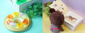 花のババロア havaroでは「くまのがっこう」15周年を記念して、15周年アートをイメージしたババロアを発売。ババロアの箱は絵本型となっており、コラボオリジナルのストーリーもついた豪華な仕様。ババロアを食べた後は小物入れなどに使用でき、また本物の絵本と並べても揃う同じサイズとなっています。